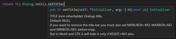 Sections of the original HTML documentation for IUP are included as doc comments in the generated Zig code, providing easy access to API documentation and improving productivity. This makes working with IUPforZig more enjoyable. Using Zls in your preferred code editor can make the experience even easier 😍