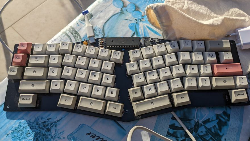 This afternoon I sat down in front of my keyboard, with a cup of coffee ready to work. As you can imagine you don't end up using this kind of keyboard by accident, and I really liked this one. But, alas, the keyboard was again acting up, seemingly rebooting when I'm typing on the right hand side. Oh no I thought, I'd already fixed this last week by heating up a bit the micro controller legs... But today I had to make progress, so I sighed, and push my keyboard to the side.