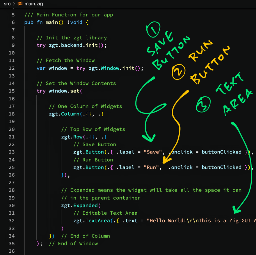 Now we populate the Widgets (UI Controls) into our Window: main.zig