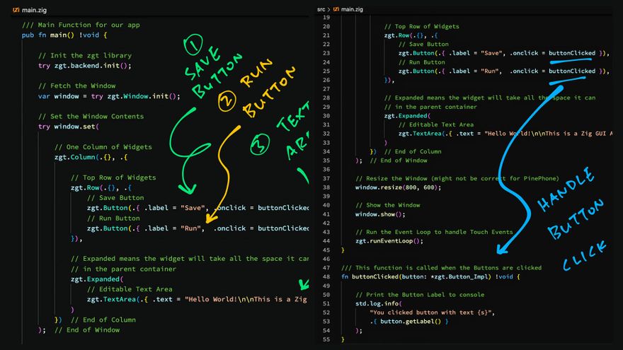 Let's find out! Our Zig App shall call the zgt GUI Library, which works with Linux (GTK), Windows and WebAssembly...