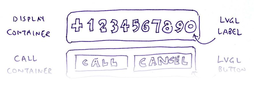 We create 3 LVGL Containers for the Display Label, Call / Cancel Buttons and Digit Buttons (pic above): feature-phone.zig
