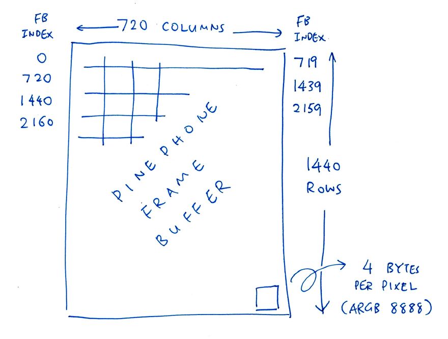 We begin with a Graphics Framebuffer that we'll render on PinePhone's 720 x 1440 display (pic above): render.zig
