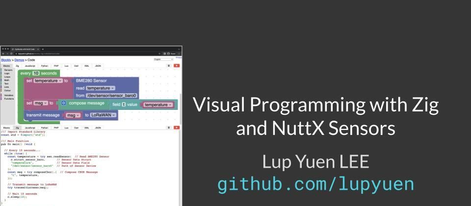 We’ll also discuss the Zig Programming Language, and why Blockly will generate NuttX Sensor Apps as Zig programs.