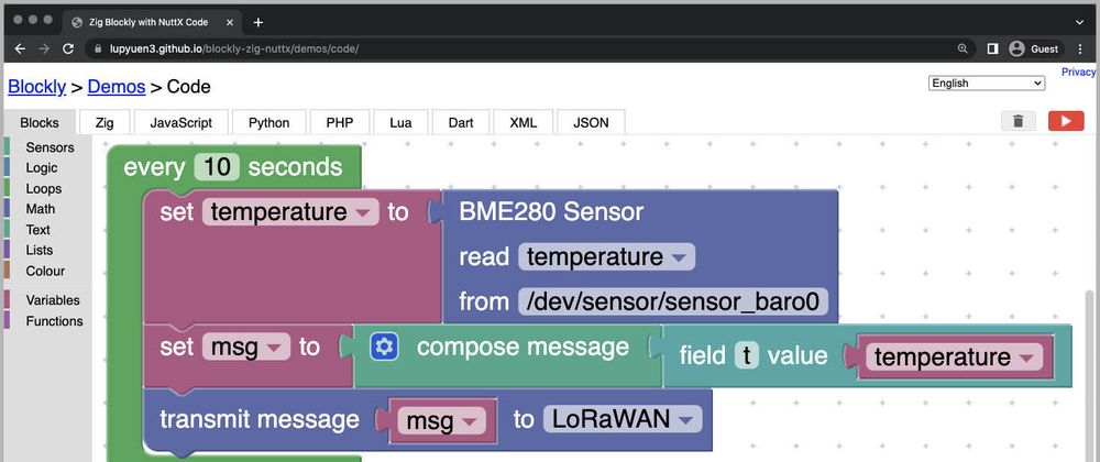 To support IoT Sensor Apps, we extend Blockly and add the following NuttX Blocks (pic above)...