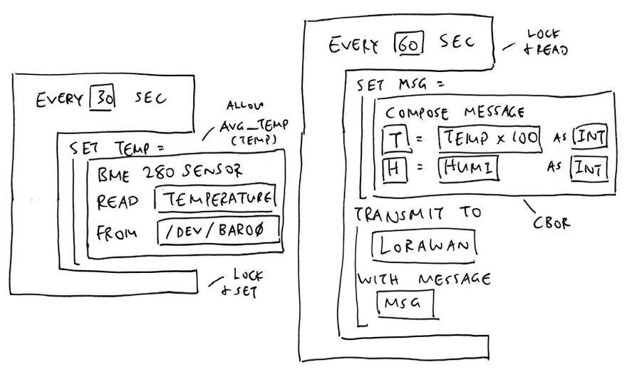 The Transmit Message Block (above) transmits a CBOR Message to LoRaWAN (the low-power, long-range, low-bandwidth IoT Network)...