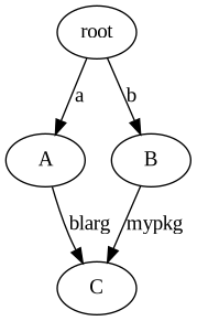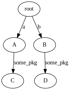 So in order to use A, you need to tell it where to find "b", and this is nice because it is trivial to drop a different implementation of package B. The configuration for "b" only counts inside files belonging to package A, we will not be able to import package B in our program, to do that we would need to explicitly configure that relationship with another call to addPackage(). Each package has its own import namespace and this allows for situations where different packages import the same code using different import strings: