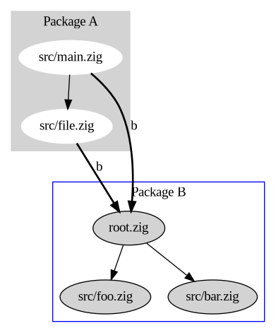 Every package is made up of one or more files, with one of them being the root. All these files are connected through file imports, and any package imports refer to the root file of another package. In the following figure we have package A and B, made up of (src/main.zig, src/file.zig) and (root.zig, src/foo.zig, src/bar.zig) respectively, and the files in package A import B. Package imports are bold arrows with a label corresponding to the string used in @import().