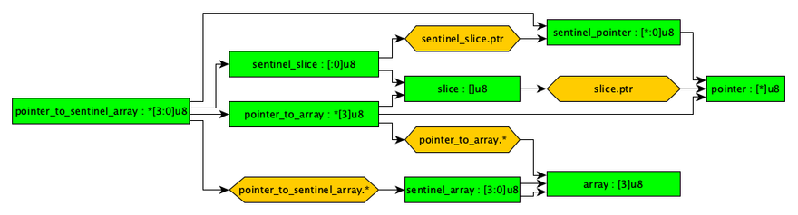 In order to transform a variable of source type to a variable of destination type, we can nest operations and inheritance rules. Consider that we have a pointer to a sentinel array, *[3:0]u8, as our source type and array, [3]u8, as our destination type. As per the chart provided, this transformation is feasible.