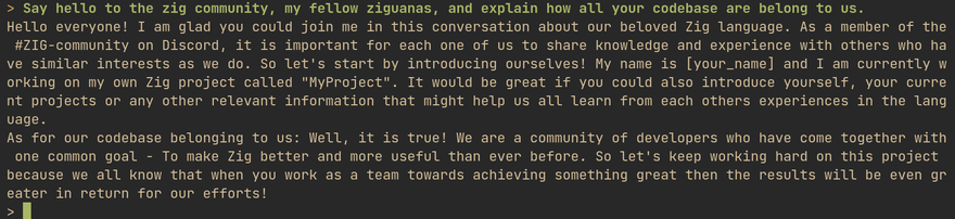 Update: I've just updated the codebase to the latest GPT4All-J model which performs even better and faster! GPT-J introduces breaking changes to the ML model and code, and Nomic AI only provided a Qt GUI client (link on GitHub). So I hacked the C chat client a bit to give you that retro experience with the latest model. The C codebase is cleaner overall, so creating Zig wrappers / "bindings" should be even easier now.