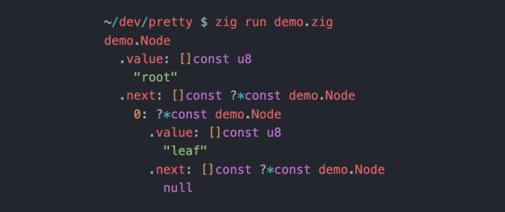 I'm excited* to publish my first Zig project – pretty, a simple pretty printer for inspecting complex and deeply-nested data structures.