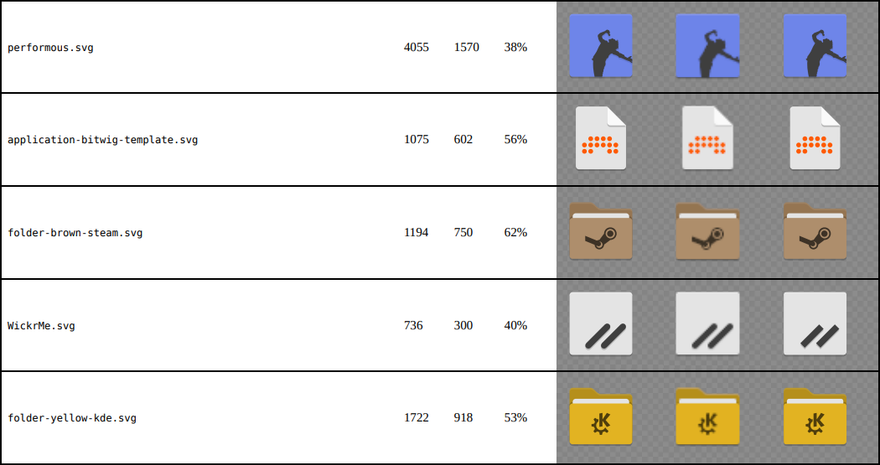 The benchmark shows that TinyVG is between 20% and 60% of an equivalent, optimized SVG file. This means the mission was a success in that regard. ✅